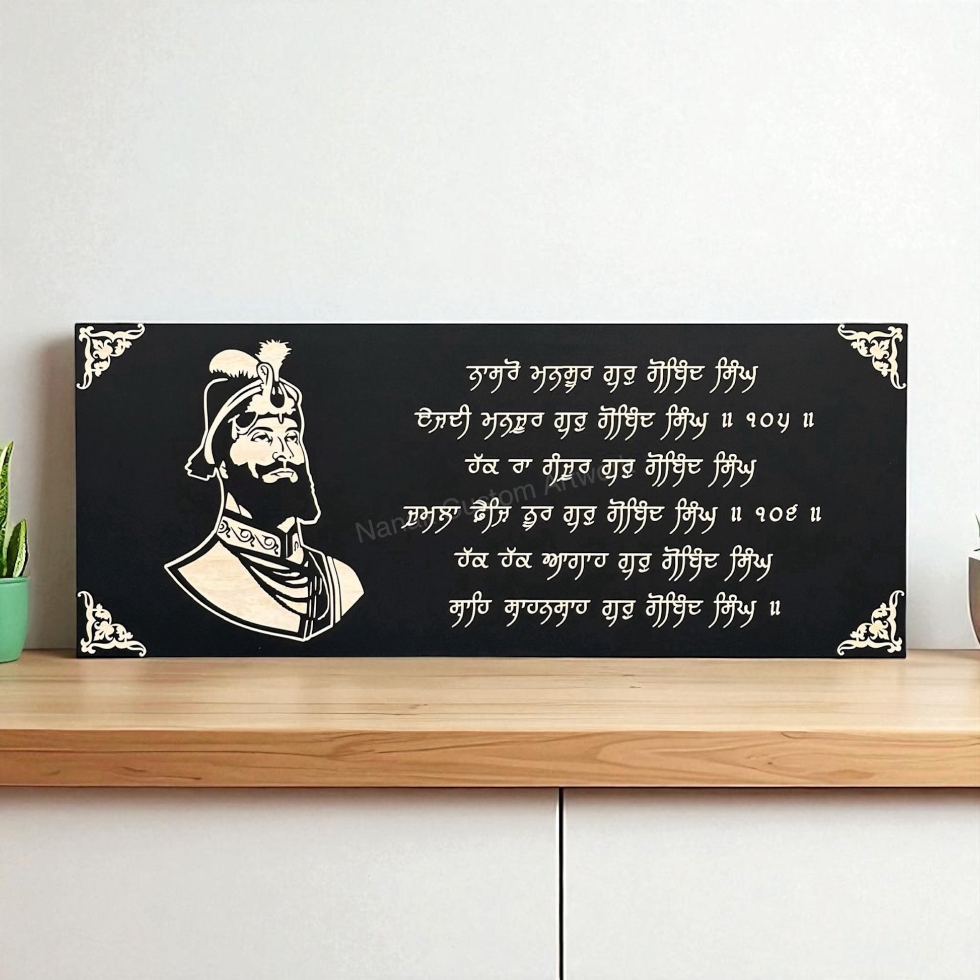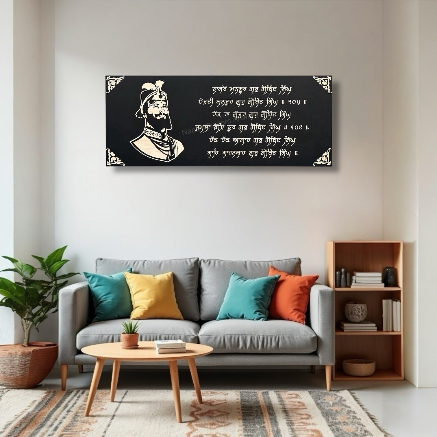 The Guru Gobind Singh Ji Wall Art features a portrait and gurbani lines "ਨਾਸਰੋ ਮਨਸੂਰ ਗੁਰੂ ਗੋਬਿੰਦ ਸਿੰਘ ॥ ਏਜ਼ਦੀ ਮਨਜ਼ੂਰ ਗੁਰੂ ਗੋਬਿੰਦ ਸਿੰਘ " , making it a spiritual addition to your home. This piece pays tribute to Guru Gobind Singh Ji, a courageous Warrior-Saint, poet, scholar, and visionary leader of the Sikhs.
