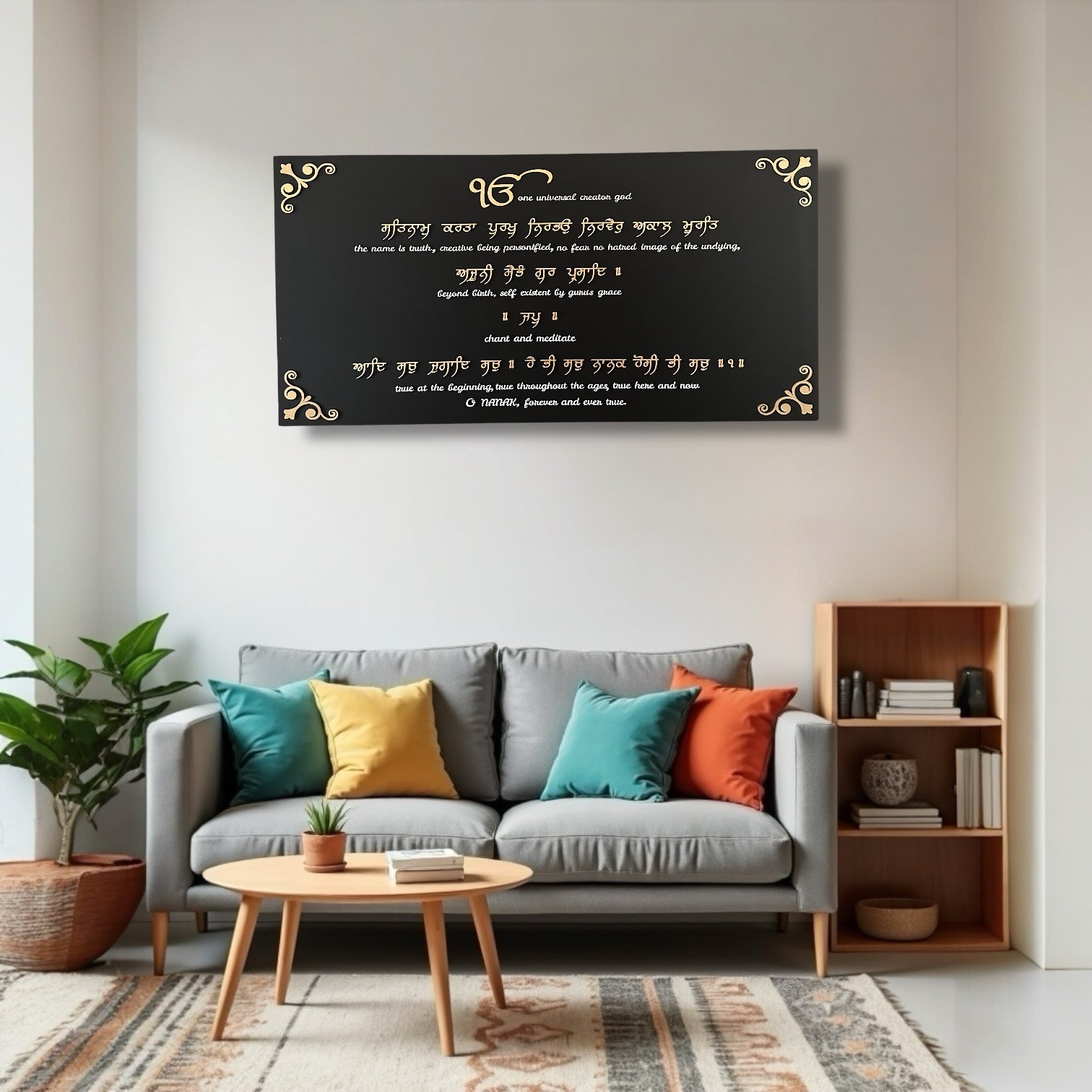 Improve the sacredness of your household with our expertly crafted Black Moolmantar Plaque, featuring golden letters and a meaningful white design. Adorned with refined corners and intricately carved wood letters, every symbol holds deep significance.