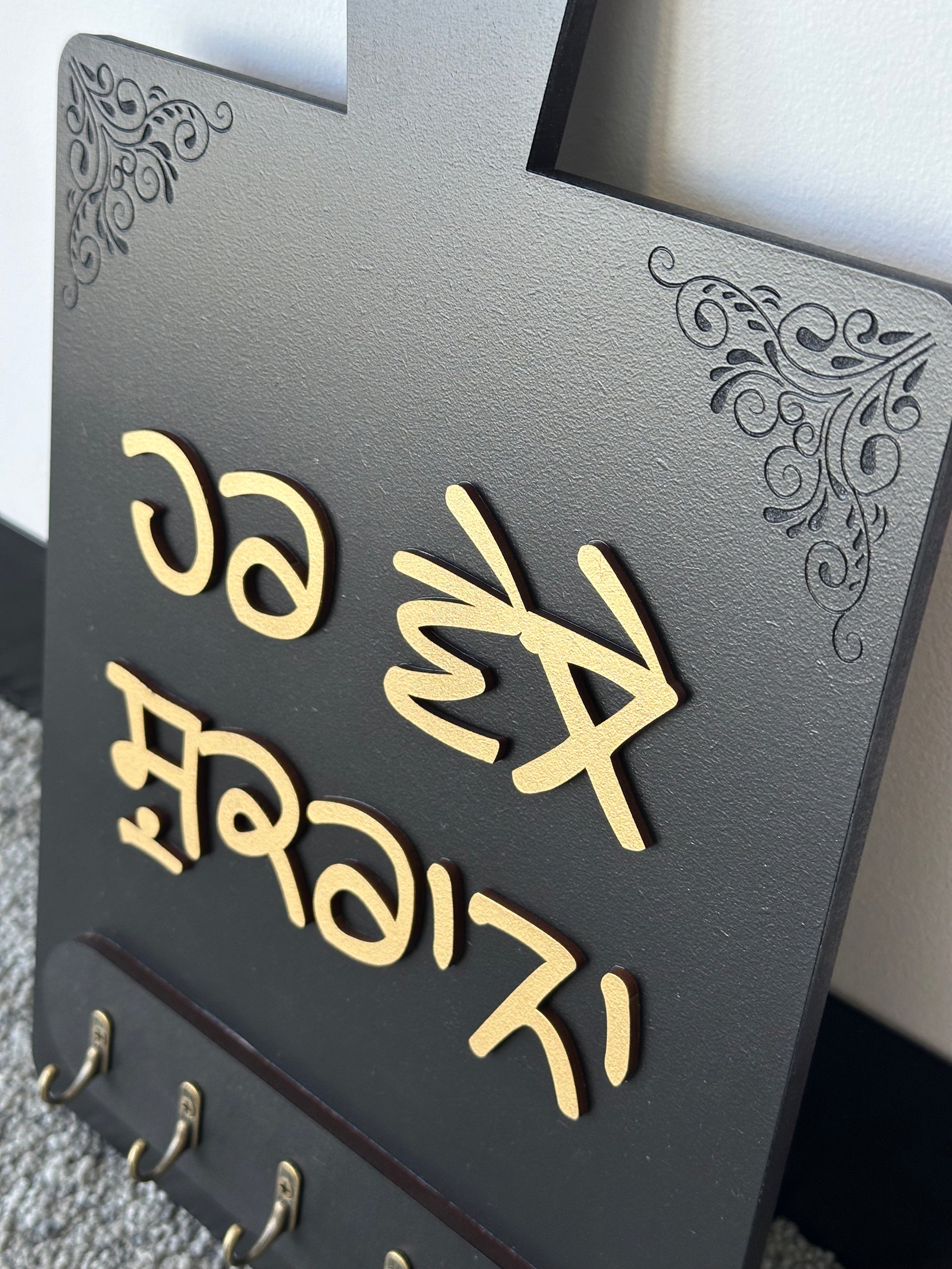 Expertly crafted and thoughtfully designed with durable brass hooks, the Black & Gold Har Vele Shukrana Key Holder is a sophisticated and functional addition to any household. Keep your keys in order and within reach while adding a touch of refinement to your living space. Count on its superior quality and expert craftsmanship to elevate your daily routine.