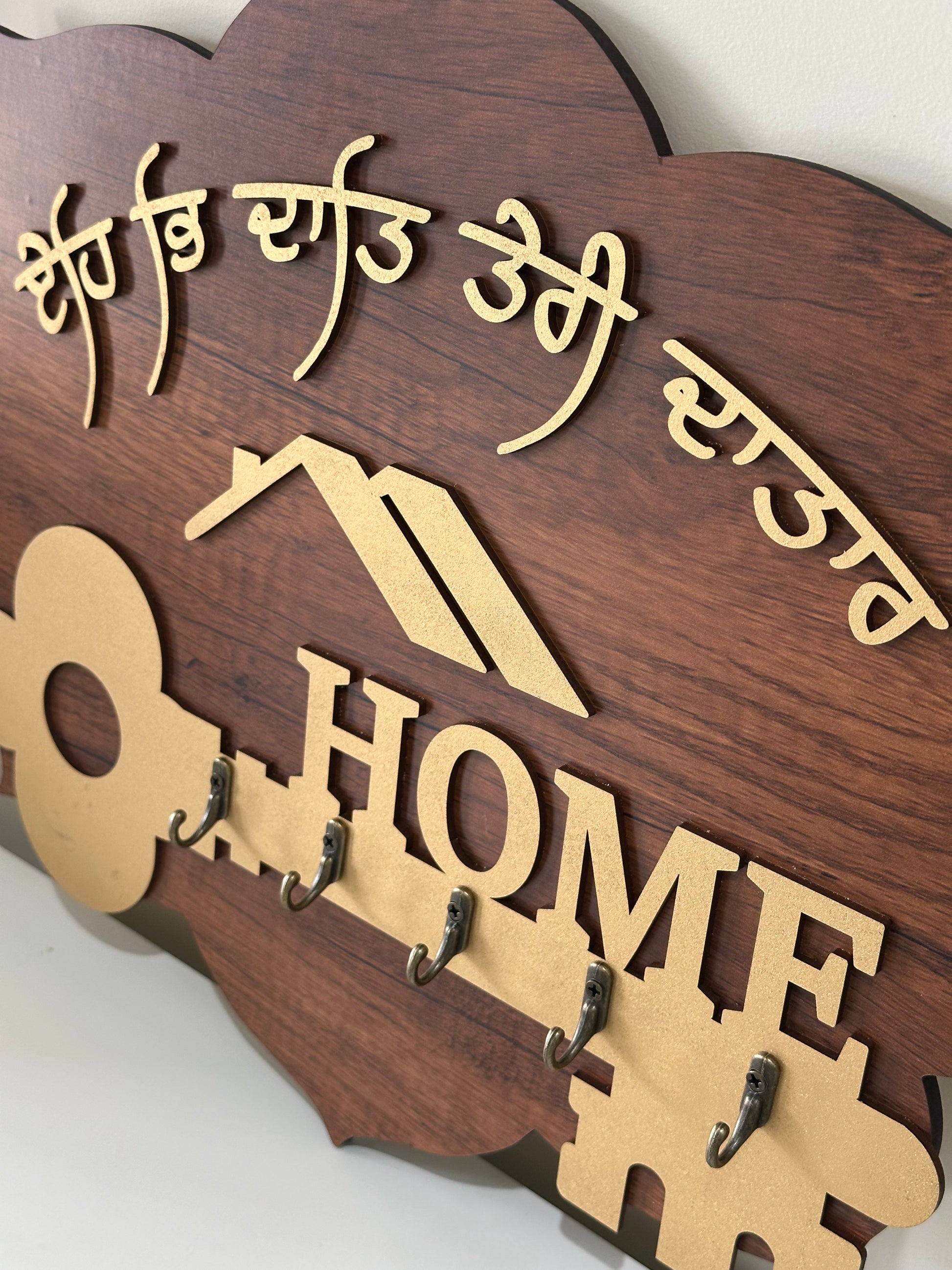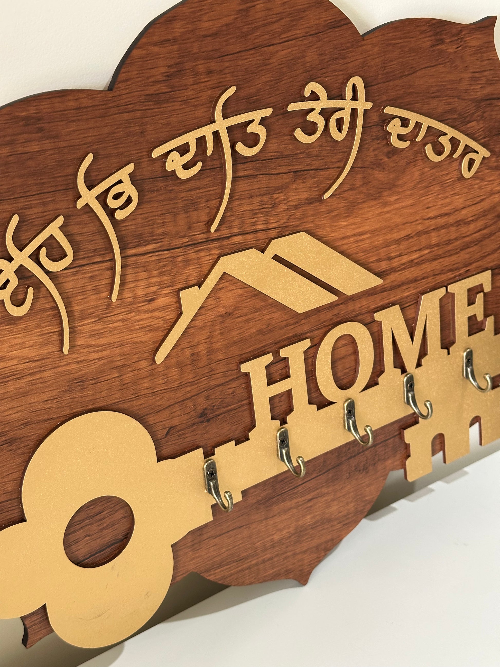 This Home Key Holder boasts expert craftsmanship and features brass hooks. Its elegant design, complete with a gurbani line, makes it both stylish and functional. Keep your keys organized and at hand while adding a touch of sophistication to your home.